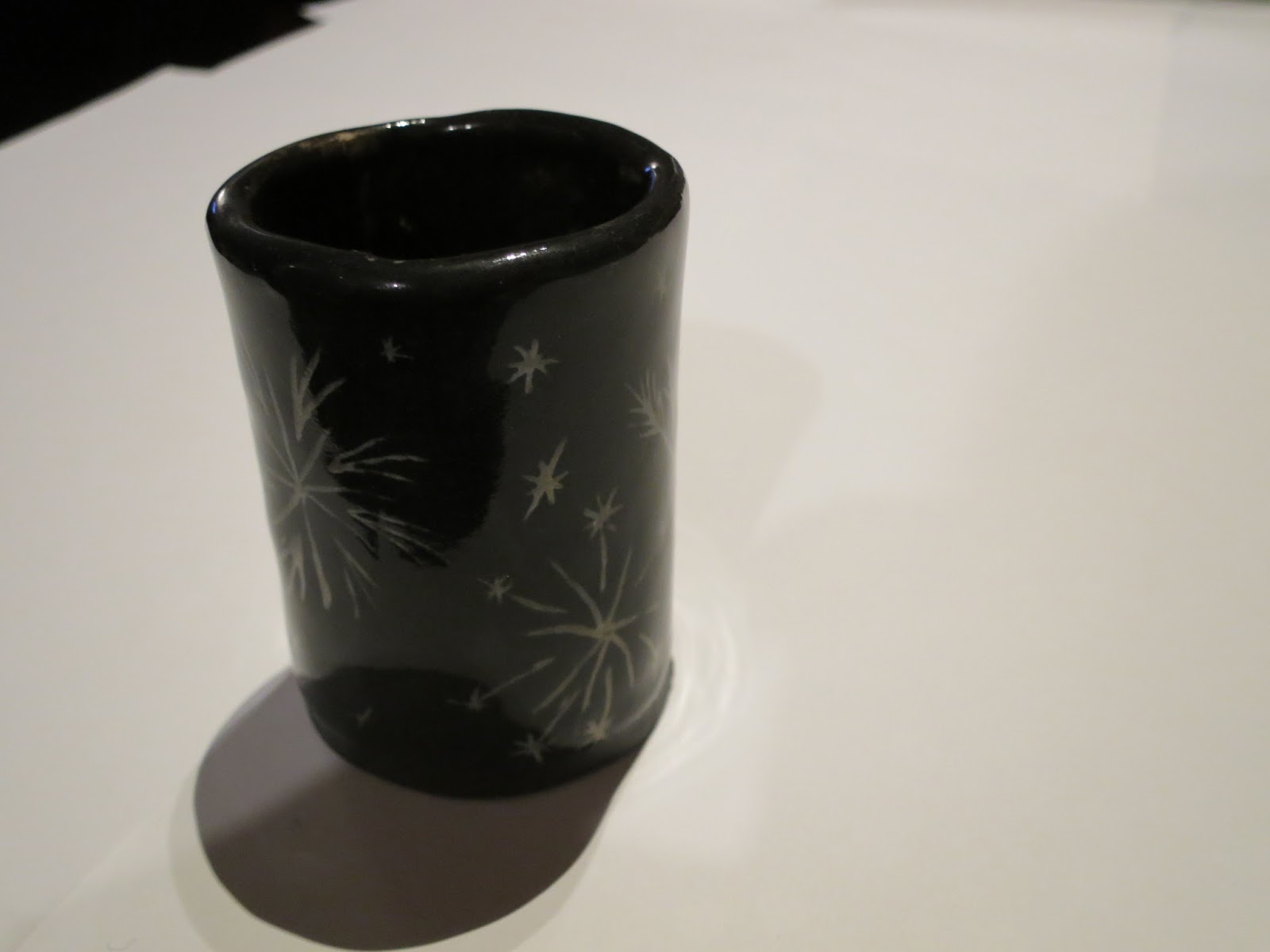 i only took pictures of a couple of things though.. ..every class i take i make myself a little little cup thingy.. i have a collection of them on my shelf cause i have taken, oh.. i dont know? 5? classes? ..but this time i painted my cup with coloured slips and then finished it with black slip and then carved fireworks into it!~ ...however, i carved too deep, and all you can see is the white clay underneith.. oh well.